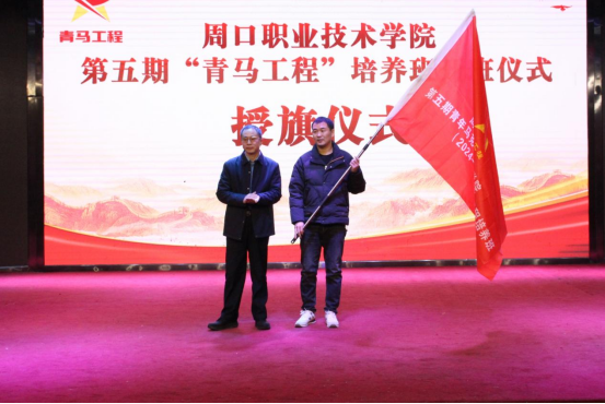 郭汝禮為第五期“青馬工程”培養(yǎng)班鄭重授旗,班主任普俊老師接受授旗。