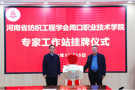 楊潤凱、李明臣為河南省紡織工程學(xué)會周口職業(yè)技術(shù)學(xué)院專家工作站揭牌。