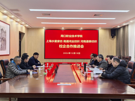 12月19日下午,周口職業(yè)技術(shù)學(xué)院與上海水星家用紡織品股份有限公司、南通鴻業(yè)紡織有限公司、河南通泰紡織有限公司召開校企合作推進(jìn)會。校黨委副書記李明臣出席,經(jīng)濟(jì)與管理學(xué)院、紡織服裝學(xué)院負(fù)責(zé)人及師生代表參加。教務(wù)處處長李嘉主持。