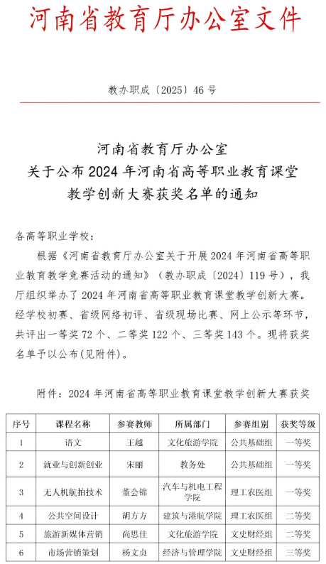 近日,河南省教育廳公布了2024年河南省高等職業(yè)教育課堂教學(xué)創(chuàng)新大賽獲獎名單。我校6名參賽教師全部獲獎,其中榮獲一等獎3項、二等獎2項、三等獎1項。