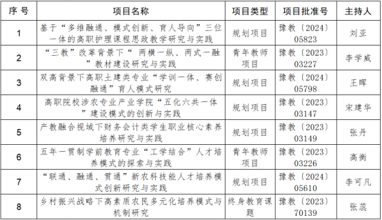 近日,河南省教育廳發(fā)布了《關(guān)于公布2024年河南省職業(yè)教育教學(xué)改革研究與實(shí)踐項(xiàng)目和終身教育課題結(jié)項(xiàng)項(xiàng)目的通知》(教辦職成〔2025〕224號),我校8個(gè)項(xiàng)目獲批結(jié)項(xiàng)。其中,職業(yè)教育教改項(xiàng)目7項(xiàng)、終身教育課題1項(xiàng)。