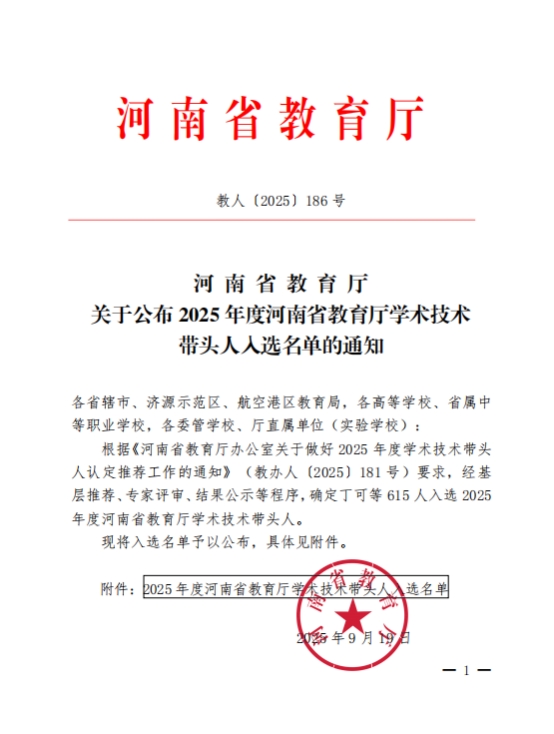 河南省教育廳學(xué)術(shù)技術(shù)帶頭人評(píng)選是全省教育系統(tǒng)重要人才評(píng)審項(xiàng)目,是加強(qiáng)我省教育系統(tǒng)專業(yè)技術(shù)人才梯隊(duì)建設(shè)、培育高層次青年人才的重要舉措。