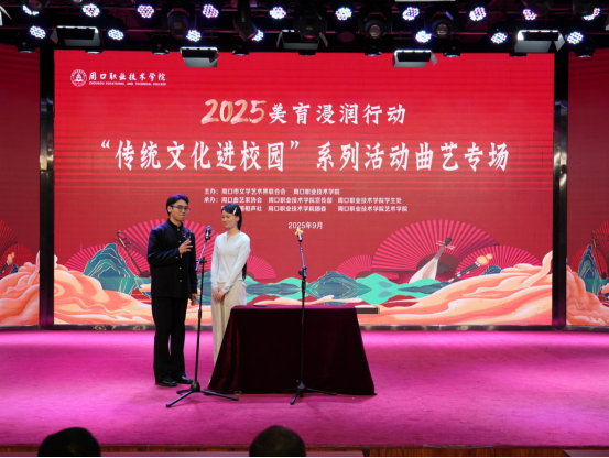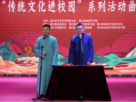 為傳承中華優(yōu)秀傳統(tǒng)文化,豐富校園文化生活,9月25日晚,周口曲藝協(xié)會、周口大嘻相聲社攜手走進(jìn)周口職業(yè)技術(shù)學(xué)院,2025美育浸潤行動“傳統(tǒng)文化進(jìn)校園”系列活動曲藝專場在藝術(shù)演播廳精彩開演。校黨委副書記李明臣、副校長王隼,周口市文聯(lián)副主席齊紅海,周口市曲藝家協(xié)會副主席王壹民及學(xué)校多位領(lǐng)導(dǎo)嘉賓蒞臨活動現(xiàn)場,與師生共賞曲藝文化視聽盛宴。