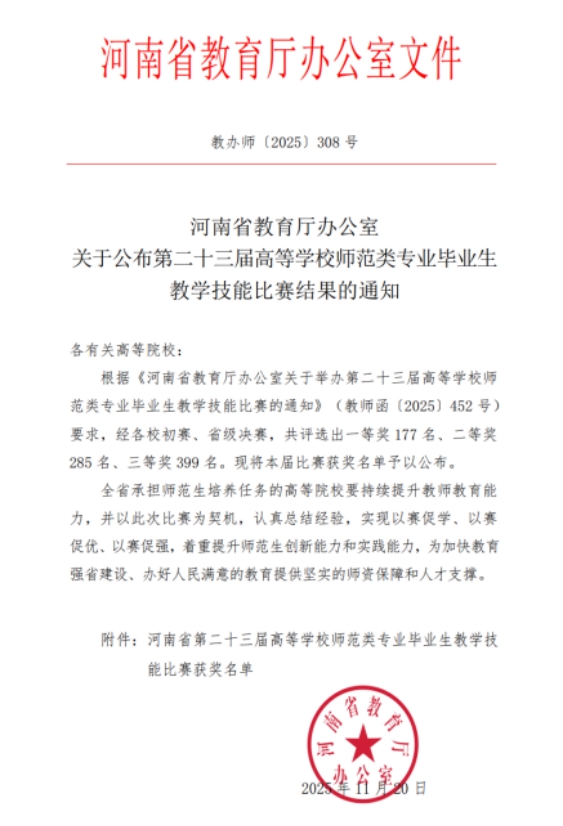 近日,河南省教育廳公布了第二十三屆高等學(xué)校師范類專業(yè)畢業(yè)生教學(xué)技能比賽結(jié)果。我校學(xué)生憑借扎實(shí)的專業(yè)功底、出色的教學(xué)技能和穩(wěn)定的現(xiàn)場(chǎng)表現(xiàn),共獲得二等獎(jiǎng)2項(xiàng)、三等獎(jiǎng)2項(xiàng)。