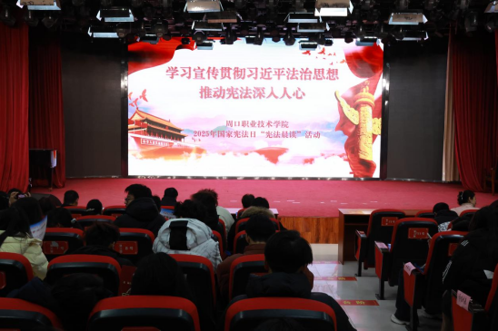 在第十二個國家憲法日到來之際,為深入學習貫徹黨的二十屆四中全會精神,認真貫徹習近平法治思想,進一步弘揚憲法精神、維護憲法權威、增強法治觀念、普及憲法知識,12月4日上午,我校在開元校區(qū)藝術演播廳設置分會場,通過收看直播的形式參與2025年國家憲法日“憲法晨讀”活動。校領導李明臣、李秀萍,相關職能部門負責人,各二級院(部)黨總支書記、學管副院長及200余名師生代表在分會場參加活動,全校萬余名師生分班級開展國家“憲法晨讀”活動。