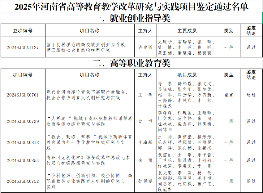 近日,河南省教育廳辦公室印發(fā)《關(guān)于公布2025年度河南省高等教育教學(xué)改革研究與實踐項目鑒定結(jié)果的通知》(教高〔2026〕5號),我校申報的6項教育教學(xué)改革研究與實踐項目全部順利通過鑒定,其中,就業(yè)創(chuàng)業(yè)指導(dǎo)類項目1項,高等職業(yè)教育類項目5項。