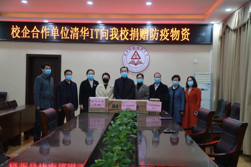 3月27日上午,信息工程學(xué)院校企合作單位清華IT駐我校負(fù)責(zé)人王智華代表企業(yè)向我校捐贈(zèng)天坤額溫槍6臺(tái)、84消毒液400斤、醫(yī)用外科口罩500個(gè),以實(shí)際行動(dòng)助力我校抗擊新冠肺炎疫情,守護(hù)學(xué)校師生健康。此舉展現(xiàn)了該企業(yè)高度的社會(huì)責(zé)任感。我校黨委副書記、工會(huì)主席李森代表周口職業(yè)技術(shù)學(xué)院校黨委、全體師生對(duì)清華IT企業(yè)的愛心之舉表示了誠摯的感謝。