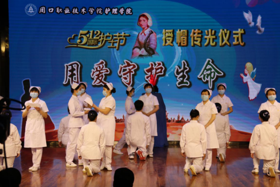 護(hù)理學(xué)院教師代表團(tuán)隊(duì)上臺(tái)舉行了授帽傳光儀式,全體老師起立和他們一起莊重宣誓,提燈女神的光芒在無言中刻畫出護(hù)理事業(yè)新老接替的神圣輪回,年輕的護(hù)理老師接過前輩手中神圣的火種,燃燒自己,照亮別人,讓南丁格爾精神代代相傳,發(fā)揚(yáng)光大。