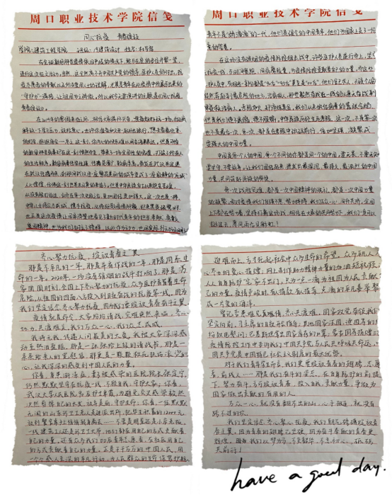 文化教育學(xué)院李云香《齊心凝聚抗疫,綻放青春之“翼”》以清新流暢的文筆展現(xiàn)了當(dāng)代青年應(yīng)以夢(mèng)為馬,不負(fù)韶華,不忘初心,砥礪前行,傳遞了青春正能量。建筑工程學(xué)院杜學(xué)雷《同心抗疫青春綻放》以故事為主線,通過一個(gè)個(gè)鮮活生動(dòng)的例子,展現(xiàn)出中國(guó)人民的強(qiáng)大凝聚力!