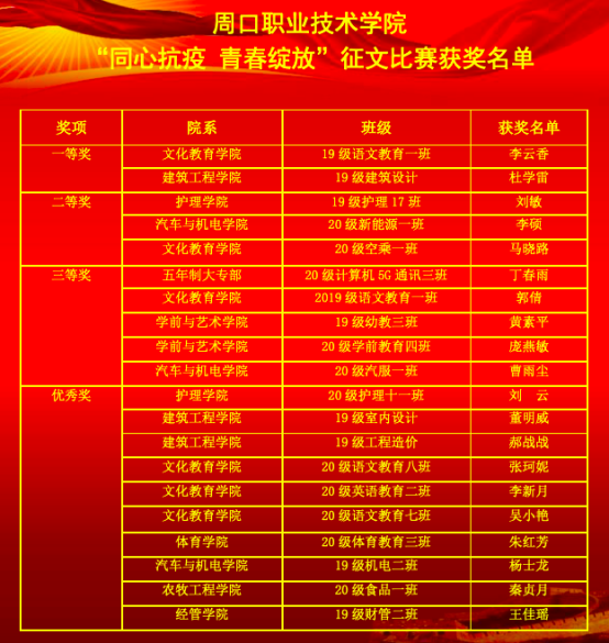 為進(jìn)一步加強(qiáng)我校心理健康教育工作,提高大學(xué)生的心理健康水平,提高大學(xué)生應(yīng)對(duì)挫折心理調(diào)節(jié)能力,致敬在“抗擊疫情阻擊戰(zhàn)”中堅(jiān)持奮戰(zhàn)在一線的最美“逆行者”,宣揚(yáng)在疫情戰(zhàn)“疫”中所涌現(xiàn)出的艱苦奮斗、可歌可泣的青春力量,進(jìn)一步激發(fā)廣大同學(xué)們的愛國(guó)熱情,周口職業(yè)技術(shù)學(xué)院心理指導(dǎo)中心組織各個(gè)二級(jí)學(xué)院舉辦了以“同心抗疫青春綻放”為主題的心理征文比賽活動(dòng)。