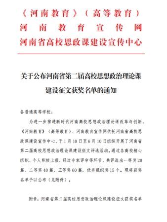 為進一步推進新時代河南高校思想政治理論課改革與創(chuàng)新,《河南教育》(高等教育)、河南教育宣傳網(wǎng)依托河南省高校思政課建設(shè)宣傳中心,于2022年1月10日至6月10日組織開展河南省第二屆高校思想政治理論課建設(shè)征文評選活動。我校馬克思主義學(xué)院高度重視,積極組織各課程組深入研討和總結(jié)課程教學(xué)中的經(jīng)驗教訓(xùn)、問題對策,撰寫論文并積極參賽。以此次比賽為契機,不斷提升廣大教師教學(xué)能力和業(yè)務(wù)素養(yǎng),進而起到帶動引領(lǐng)作用,提高整體教學(xué)研究水平。