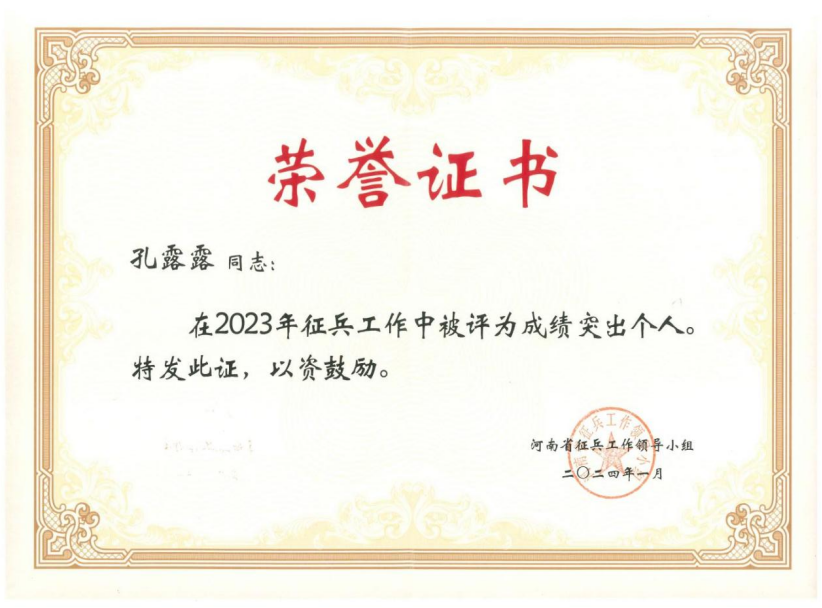 為褒揚(yáng)先進(jìn)、樹立導(dǎo)向,激勵(lì)廣大征兵工作人員在今后工作中奮發(fā)進(jìn)取、建功立業(yè),充分發(fā)揮先進(jìn)典型的帶動(dòng)作用,近日,經(jīng)河南省征兵工作領(lǐng)導(dǎo)小組審核決定,共評(píng)選出127名同志為2023年度河南省征兵工作成績(jī)突出個(gè)人,我校武裝部孔露露老師受到通報(bào)表彰。