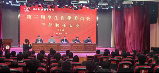 為進(jìn)一步加強(qiáng)學(xué)生干部隊(duì)伍建設(shè),11月8日下午,周口職業(yè)技術(shù)學(xué)院第三屆自律委員會干部聘任大會在開元校區(qū)藝術(shù)演播廳舉行。學(xué)生處處長劉冬霞出席會議并講話,各二級學(xué)院學(xué)管辦主任、學(xué)生處相關(guān)人員及學(xué)生干部代表參加。會議由學(xué)生處副處長王換換主持。