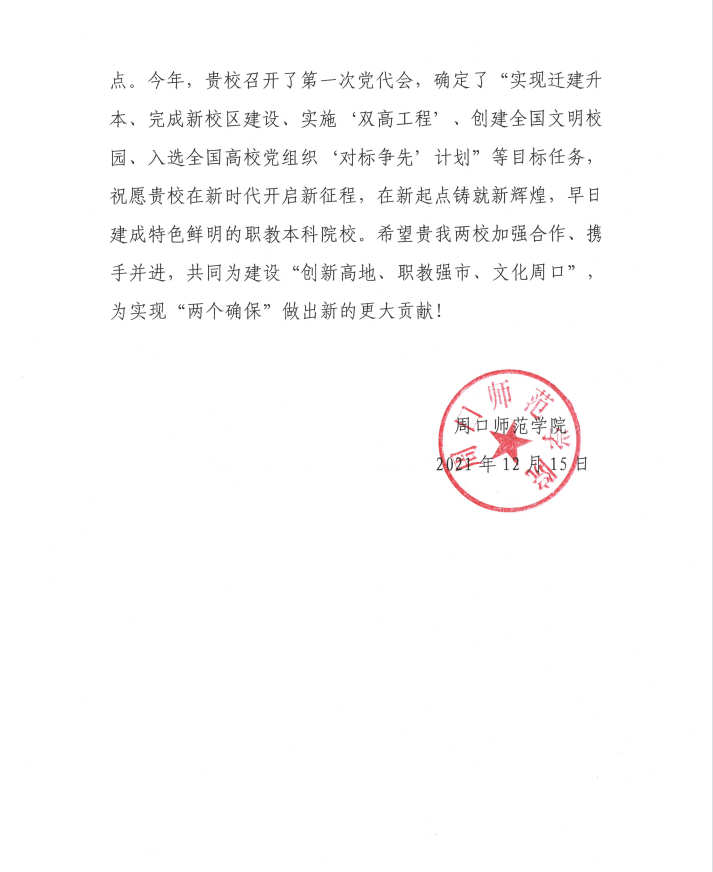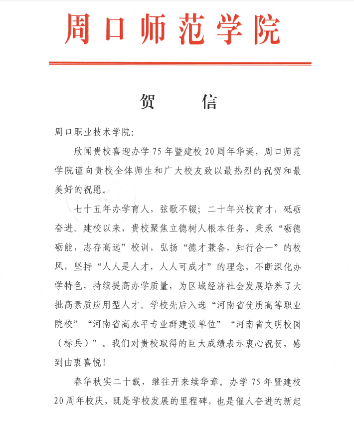 【獻禮校慶】周口師范學院賀信