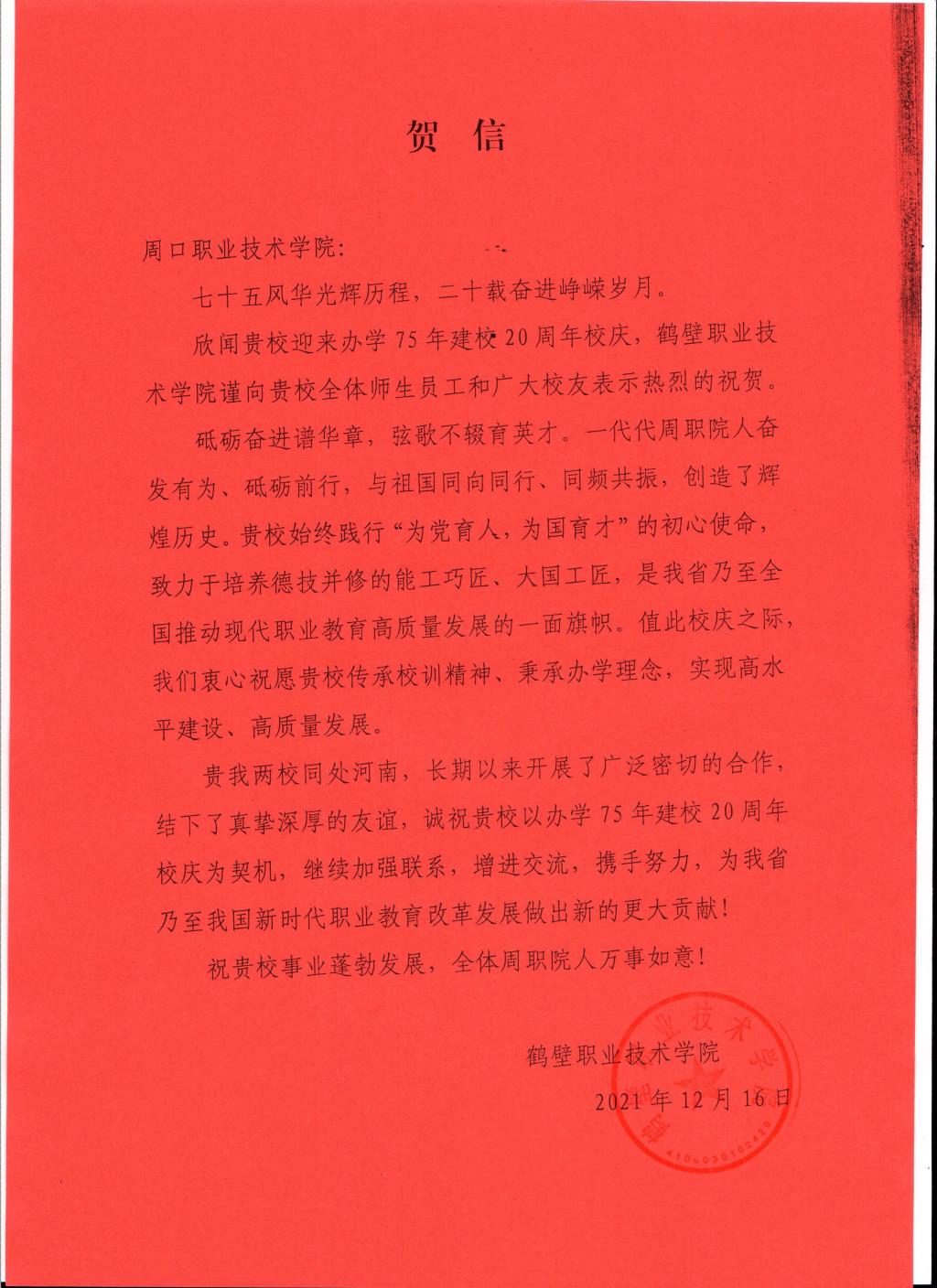 【獻禮校慶】鶴壁職業(yè)技術(shù)學院賀信