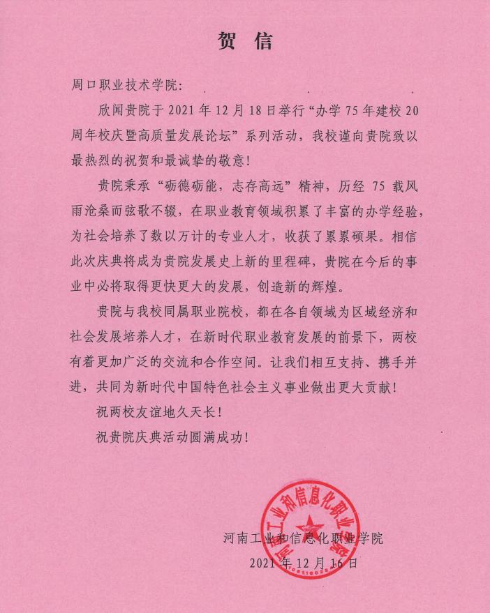 【獻禮校慶】河南工業(yè)和信息化職業(yè)學院賀信